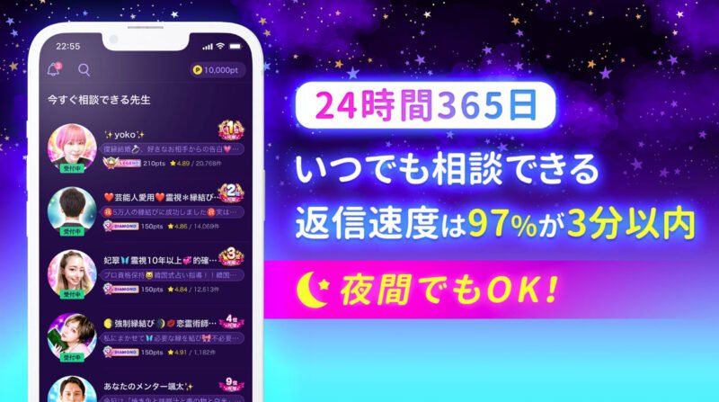 スマホ一台で誰でも手軽に占い師へ相談でき、24時間365日・完全匿名で利用できるのが大きな魅力ですよね。