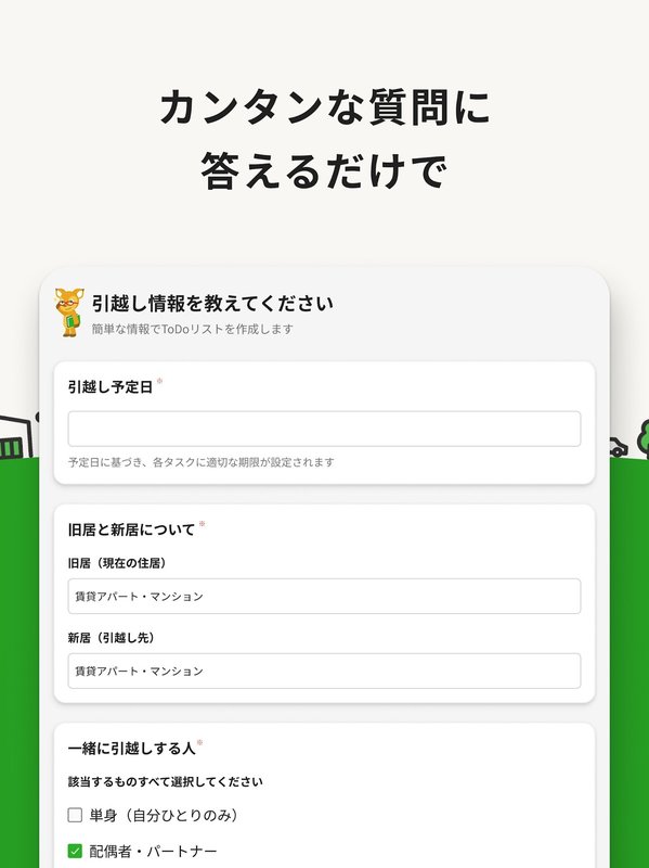 いくつかの質問に答えるだけで、あなた専用のToDoリストを自動で作成してくれる、引越し初心者にも頼もしいアプリなんです!